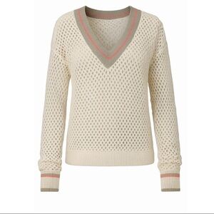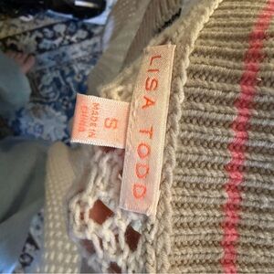 Lisa Todd Beige Wide Knit V Neck Long sleeve Sweater w/Striped neck detail. Size Small. Retail $350