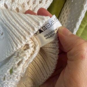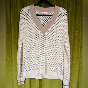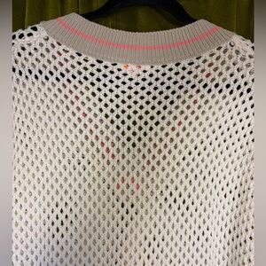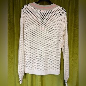 Very good condition. Brown and neon pink/orange stripe detail collar with beige creme body. Ribbed neck and cuff detail. Acrylic cotton blend. Diamond knit detail for a see through feature. Super beautiful sweater from a high end designer.