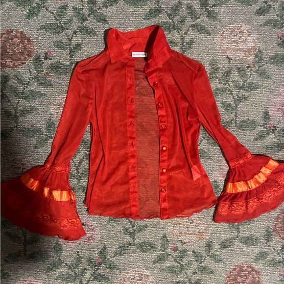 Cutest Y2K Mary Kate and Ashley sheer button up blouse with flare sleeves & lace 💘