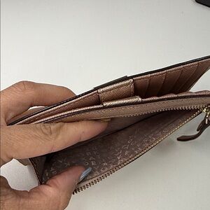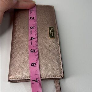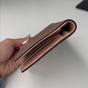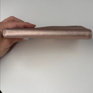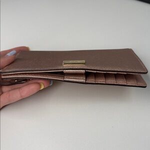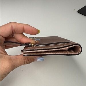 The cutest rose gold metallic wallet with gold hardware. There is room for 12 credit cards and one ID. Multiple slots for cash or checkbook, etc. measurements are in the photos. This is an excellent used condition with just a little bit of scratching on the front. Otherwise it is great! See all photos before purchasing and ask any questions below.