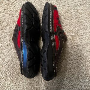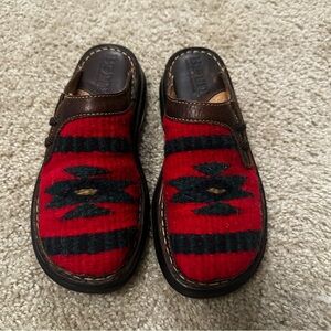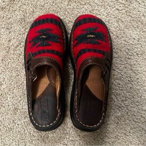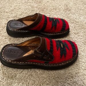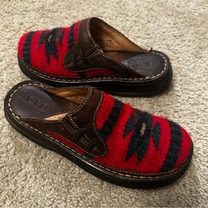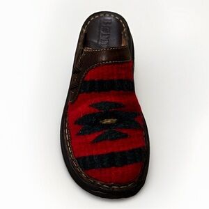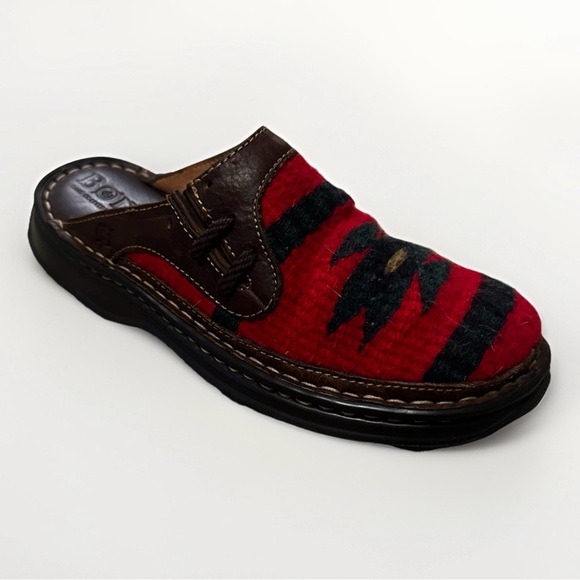 These BORN slip-on clogs are a stylish and comfortable choice for women, featuring a Southwest Aztec design in red and multicolored tones. Made with wool and leather materials, these clogs have a round toe shape and a cushioned insole for added comfort. Perfect for casual occasions in the fall, winter, or spring, these mules exude a Western, Aztec, ranch-inspired look that is both classic and Southwestern in style. Made in Mexico as part of the BORN product line, these shoes are a great addition to any wardrobe for those looking to add a touch of unique flair to their outfit.
