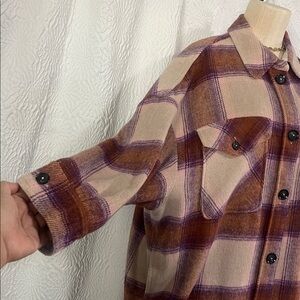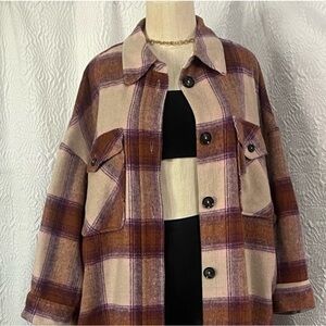 Elevate your wardrobe with this chic plaid utility jacket. Featuring a stylish brown and cream pattern, it's perfect for any casual outing. B1