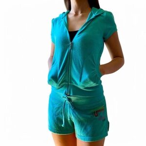 Juicy Couture Vintage Teal Terry tracksuit three piece set short sleeve jacket, t-shirt and shorts in Bermuda Sky
