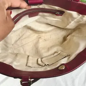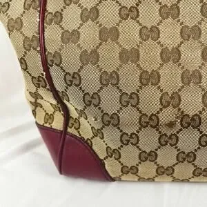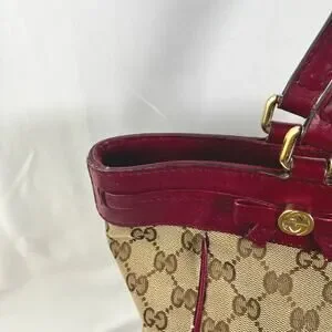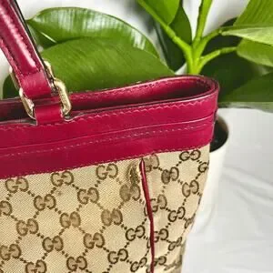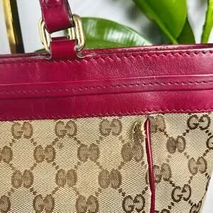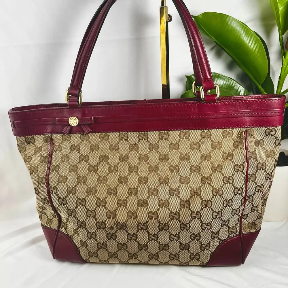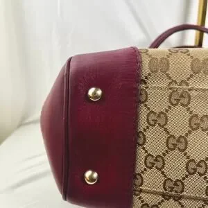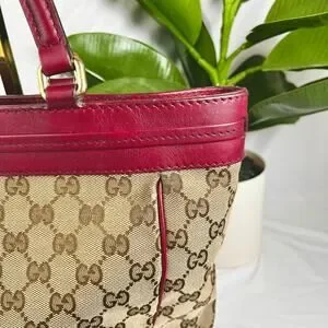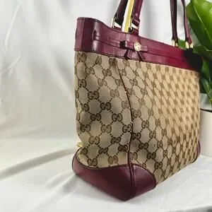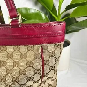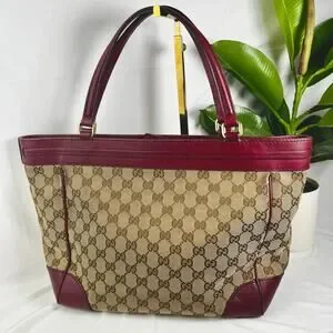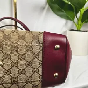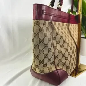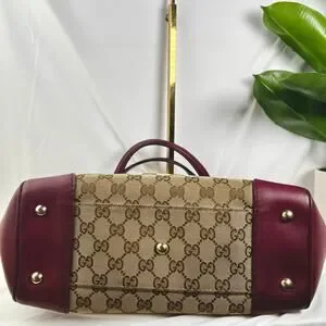 Pre-Owned Gucci Mayfair tote. This tote is vintage and has seen some love! Minor but noticable wear may include some staining, and some wear to the canvas. Two Leather straps, magnetic closure, gold hardware. Please see photos for the condition!