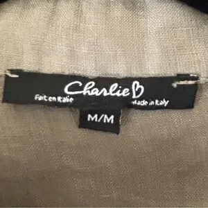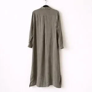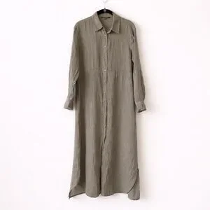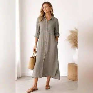 Beautiful 100% linen Charlie B shirt dress in soft sage green. Classic button-down front with collar, long sleeves, curved seam detail, and relaxed midi/maxi silhouette. Lightweight, breathable linen with effortless drape.