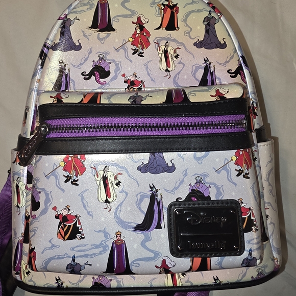 This stylish loungefly Disney villains mini backpack features a vibrant purple design with iconic villains. Perfect for adding a touch of magic to your everyday look. See pics for flaw. Check out my other loungefly, star wars, hello Kitty Disney and other brand bags and purses!