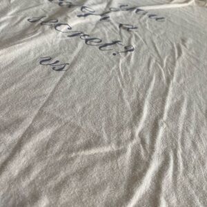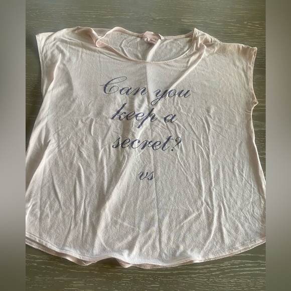 Soft pink tee with 'Can you keep a secret?' text. Comfortable short sleeves. Casual style. Lightweight. In good condition.