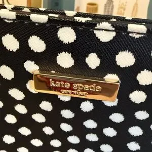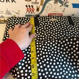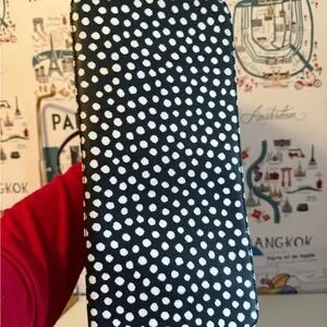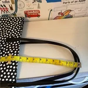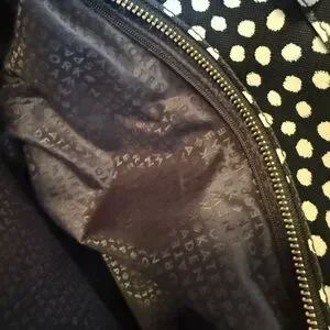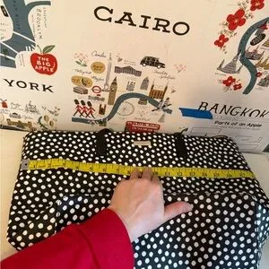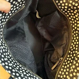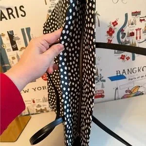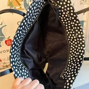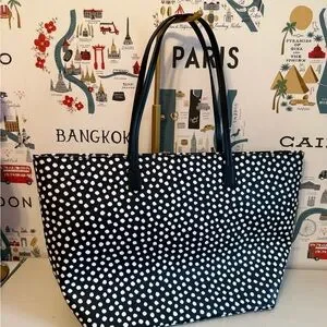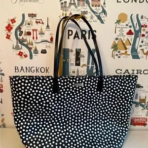 Stylish tote with playful polka dots. Ideal for everyday use. Features sturdy handles.