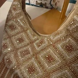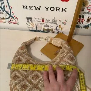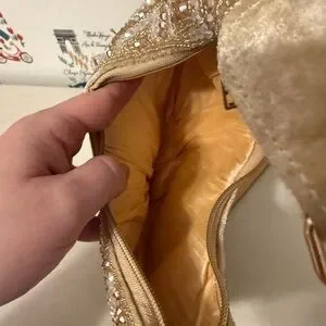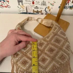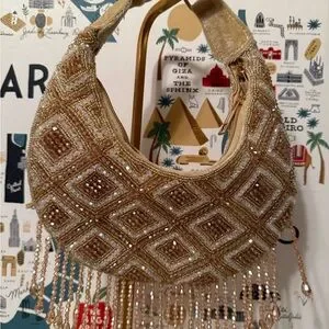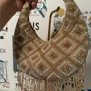 This stunning evening bag features intricate beading in a luxurious gold hue, perfect for adding a touch of glamour to any outfit. Ideal for special occasions.