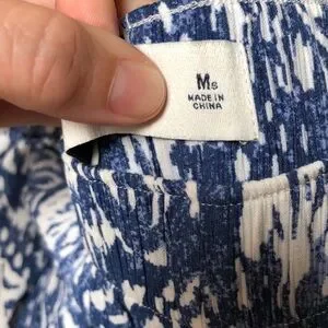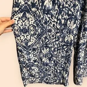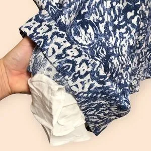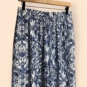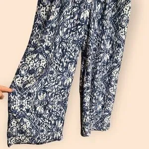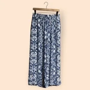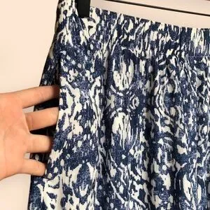 Blue and white patterned pants / stretchy elastic waist band pull on pants / ultra wide leg and roomy / lined underneath / pockets