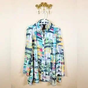 Ali Miles Lightweight tunic with an abstract brushstroke print. Button-front placket and relaxed fit. Long sleeves and soft drape. Vibrant, modern color palette. 82% rayon 18% nylon