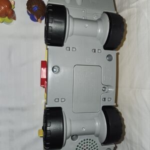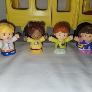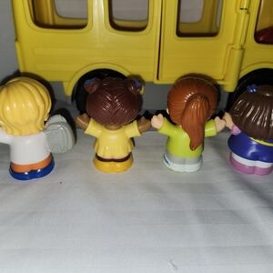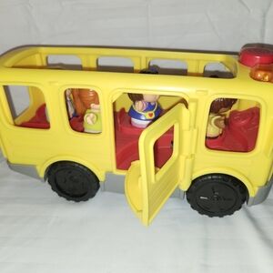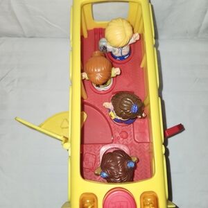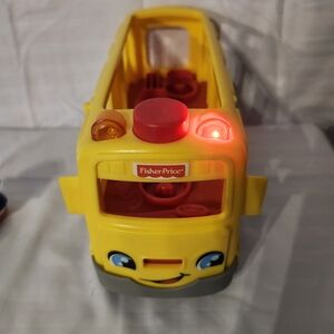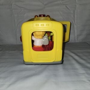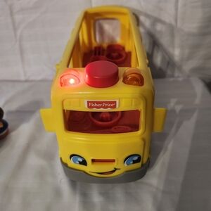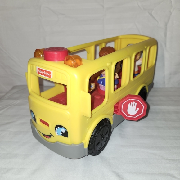 Fisher-Price yellow school bus toy for imaginative play. Bright yellow design with a red stop sign detail encourages role-play. Durable plastic construction and friendly face graphics engage young children.