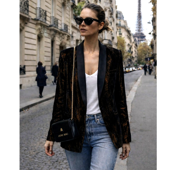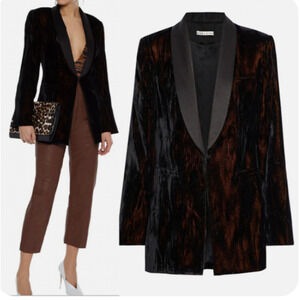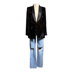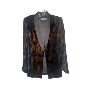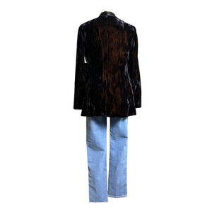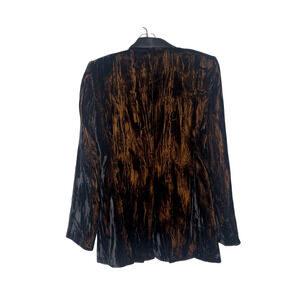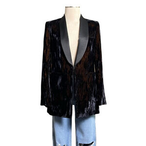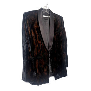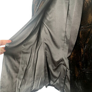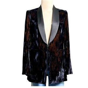 GORGEOUS crushed velvet tuxedo blazer with a satin shawl collar. The color is black with an underlying metallic copper sheen when it catches the light - super special! (I tried to show how cool the color is by showing the blazer color change with different angles in the photos)