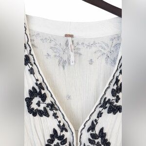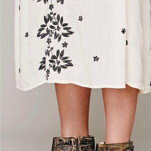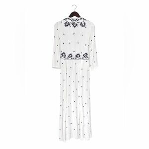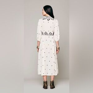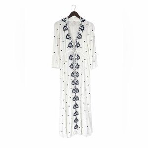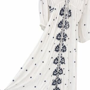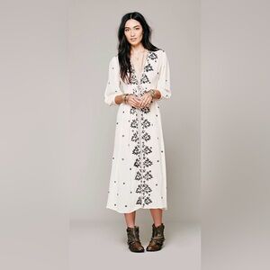 Boho-inspired cream midi dress with bold black floral embroidery down the front. Deep V-neck and relaxed fit for easy layering. Drawstring waist offers subtle shaping. Elbow sleeves and flowing skirt create effortless movement.