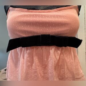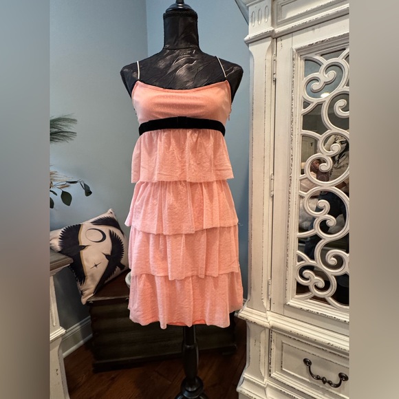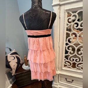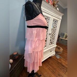 Delicate, feminine, and effortlessly charming — this Betsey Johnson blush pink tiered dress is a dreamy statement piece. Featuring soft cascading ruffle layers and a flattering silhouette, it is finished with a luxurious black velvet bow at the waist that adds a signature Betsey Johnson touch.