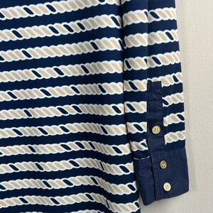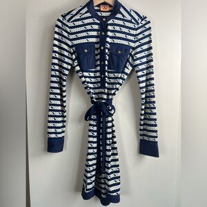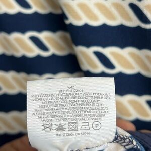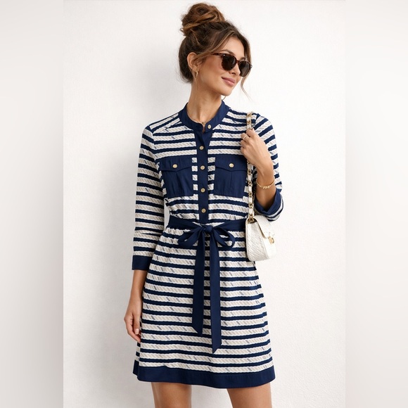 •Accents: The dress comes with a matching removable tie-waist belt in solid navy to define the figure.