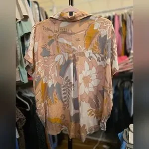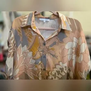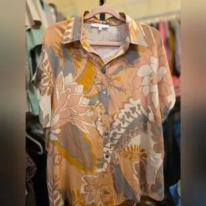 Chic blouse with earthy floral patterns. Features a button-up front and elegant collar.
