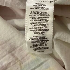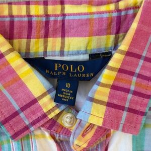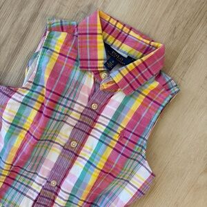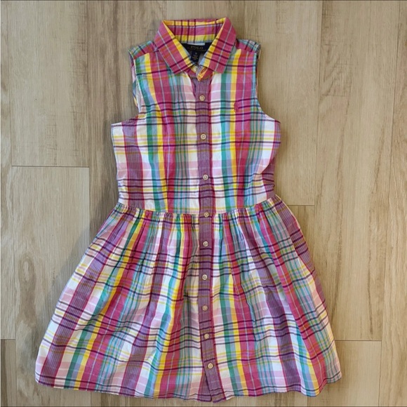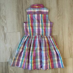 Sleeveless plaid dress with a collared neckline. Button-front closure down the center. Fitted waist with a gathered full skirt. Lightweight, breathable cotton blend. Bright multicolor stripes for playful style.
