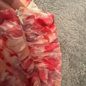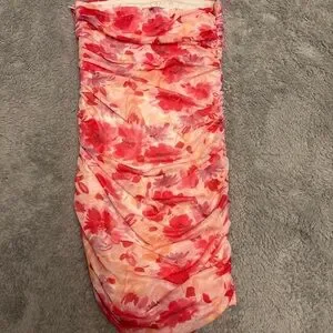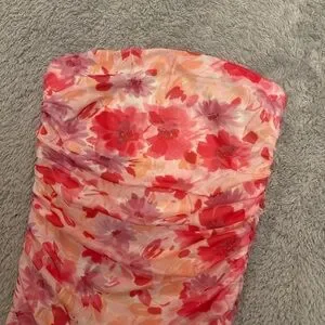 Strapless floral dress with ruched detailing. Pink and coral floral print. Slim, bodycon silhouette. Lightweight, feminine fabric. Brand new without tags. In perfect condition. Strapless dress but does have the gripping to hold up. Zipper down the side of the dress. Size 4!