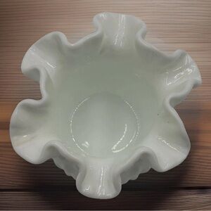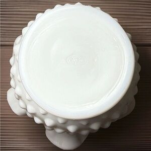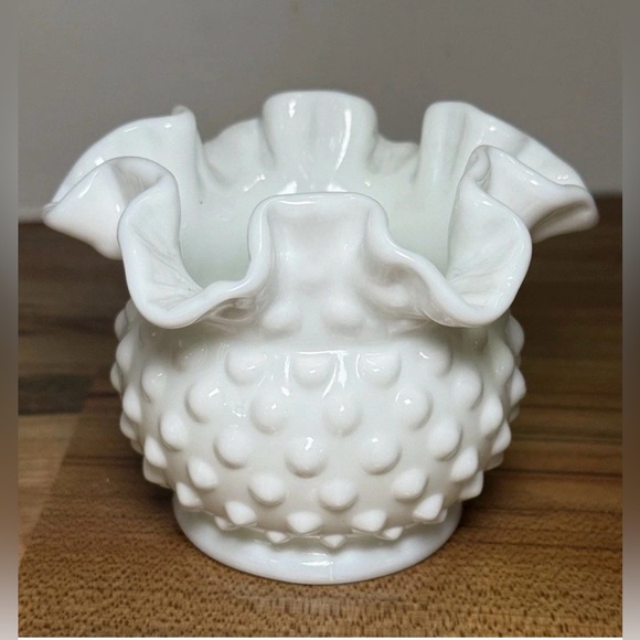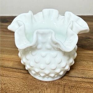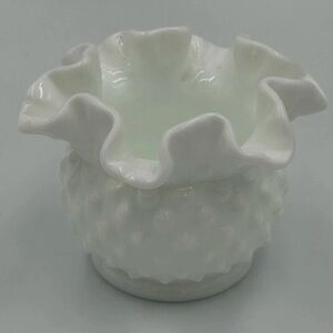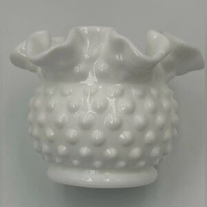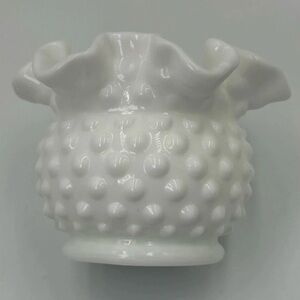 This Vintage Fenton 8 Hobnail Milk Glass Vase stands at 3" tall (4" across) with a ruffled 6 crimp rim, a beautiful and classic piece from the 80's. Made in North America by Fenton, this decorative vase features a glossy finish and a white color, perfect for any home decor. With its intricate hobnail pattern and production style of milk glass, this vase is a timeless and elegant addition to any collection. A true original piece, this Fenton vase is a must-have for any glassware enthusiast. Excellent, pristine condition.