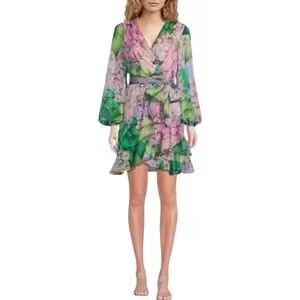 Bright and beautiful floral faux wrap dress featuring a vibrant pink, purple, green, and blue tropical-style print. Flowy lightweight fabric with long sheer sleeves, elastic cuffs, and a flattering adjustable waist tie. The ruffle hem adds a feminine touch and nice movement when worn.