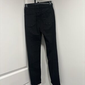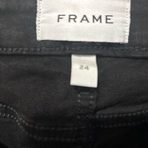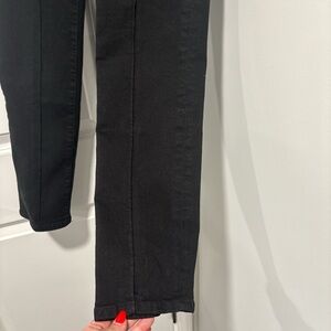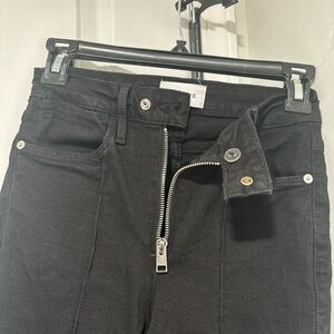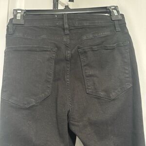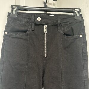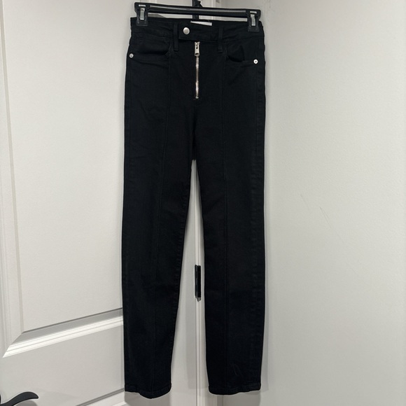 Sleek black skinny jeans by Frame Denim. High-rise waist with exposed front zipper. Streamlined seams down the legs. Clean five-pocket styling. Stretch denim for a close, comfortable fit.