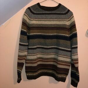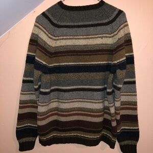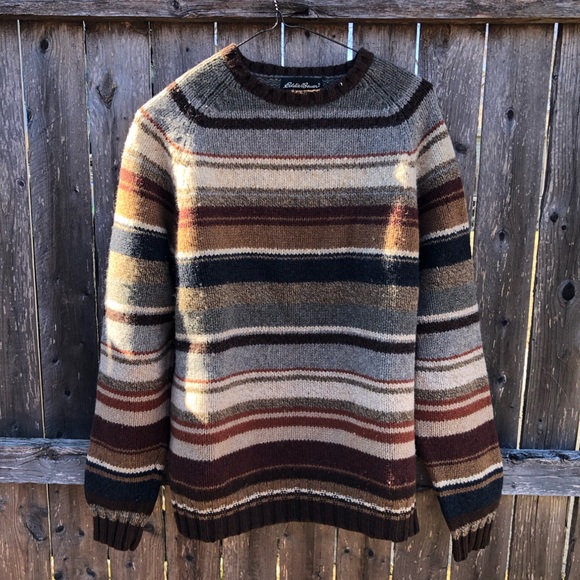 Classic Eddie Bauer crewneck with horizontal stripes. Soft knit fabric and ribbed trim. Earthy palette for versatile layering. Timeless casual style.