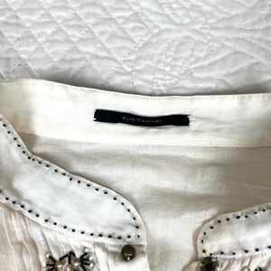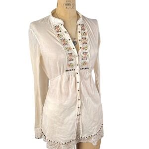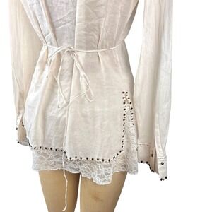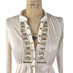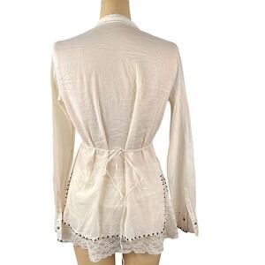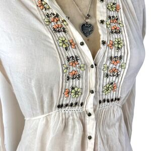 Embroidered floral long sleeve blouse with delicate lace trim and a flattering waist tie.