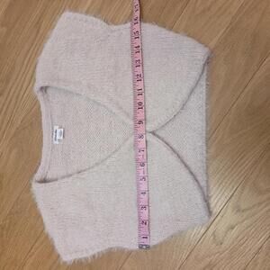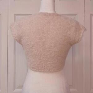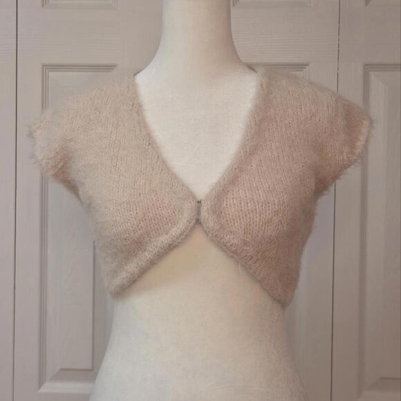 Features: soft ballet / pale rose / dusty baby pink color, fuzzy eyelash knit fabric, cropped silhouette, cap sleeves, V neckline, hook-and-eye front closure, open front design