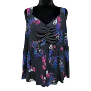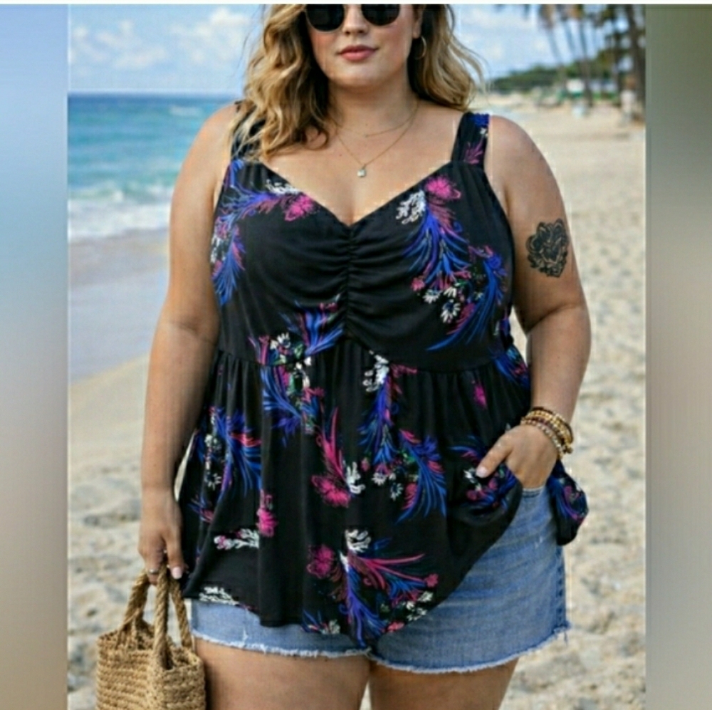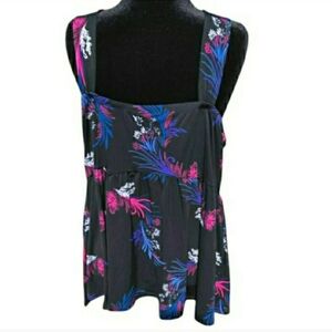 Chic and stylish black sleeveless top with vibrant floral patterns. Perfect for any occasion.