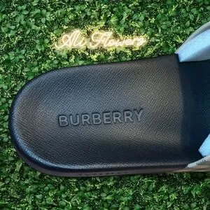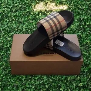 Iconic Burberry check strap. Black footbed and sole. Easy slip-on design. Classic designer style for casual wear.