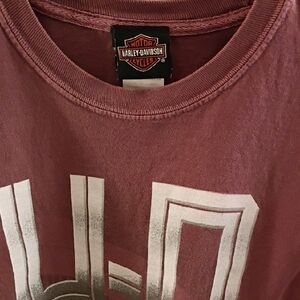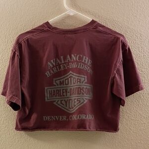 Cropped Harley-Davidson Denver Colorado tee in rich burgundy. Bold metallic silver H-D graphic and shield emblem on front. Classic crew neck and short sleeves. Easy statement piece for casual wear.