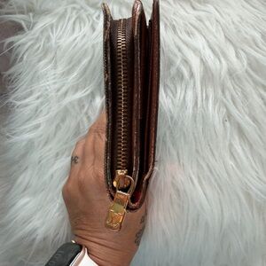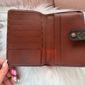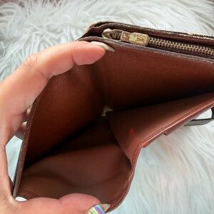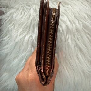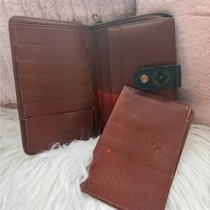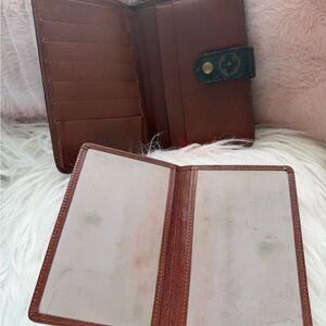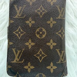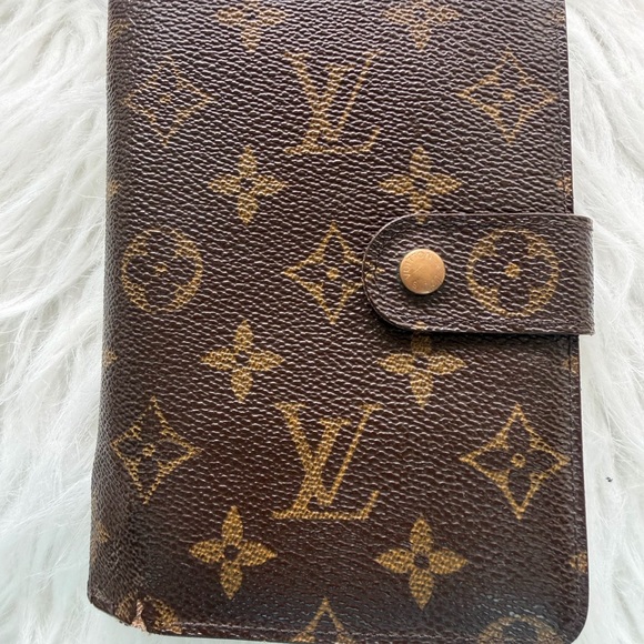 Classic Louis Vuitton monogram planner cover. Snap closure with branded button. Rich brown canvas with tan monogram pattern. Sleek, timeless design for everyday use.