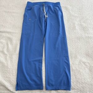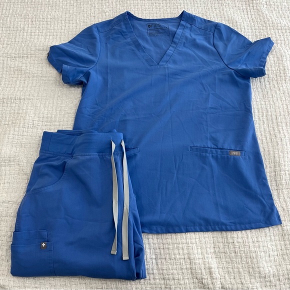 Matching FIGS scrub set in the Ceil Blue colorway. Includes the Casma three pocket scrub top and Kade cargo scrub pants. Durable stretch fabric designed for long shifts and everyday medical work.