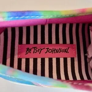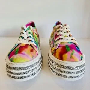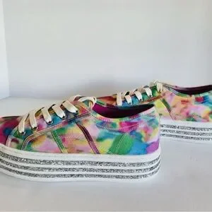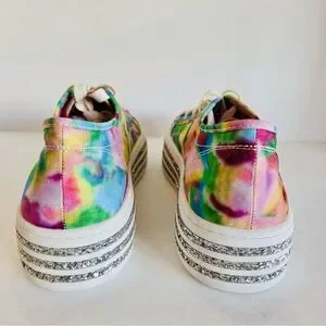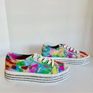The Betsey Johnson Peaze Platform Sneakers in Rainbow Glitter Tie Dye are a vibrant and stylish choice for women who want to stand out with their activewear. These size 9.5 lace-up sneakers feature a multicolor tie-dye pattern with glitter accents, adding a fun and festive touch to any outfit. The comfortable fabric lining and rubber outsole make them perfect for walking or other athletic activities, while the signature Betsey Johnson brand ensures high quality and style. Whether it's for a casual day out or a fun event, these sneakers are sure to make a statement.