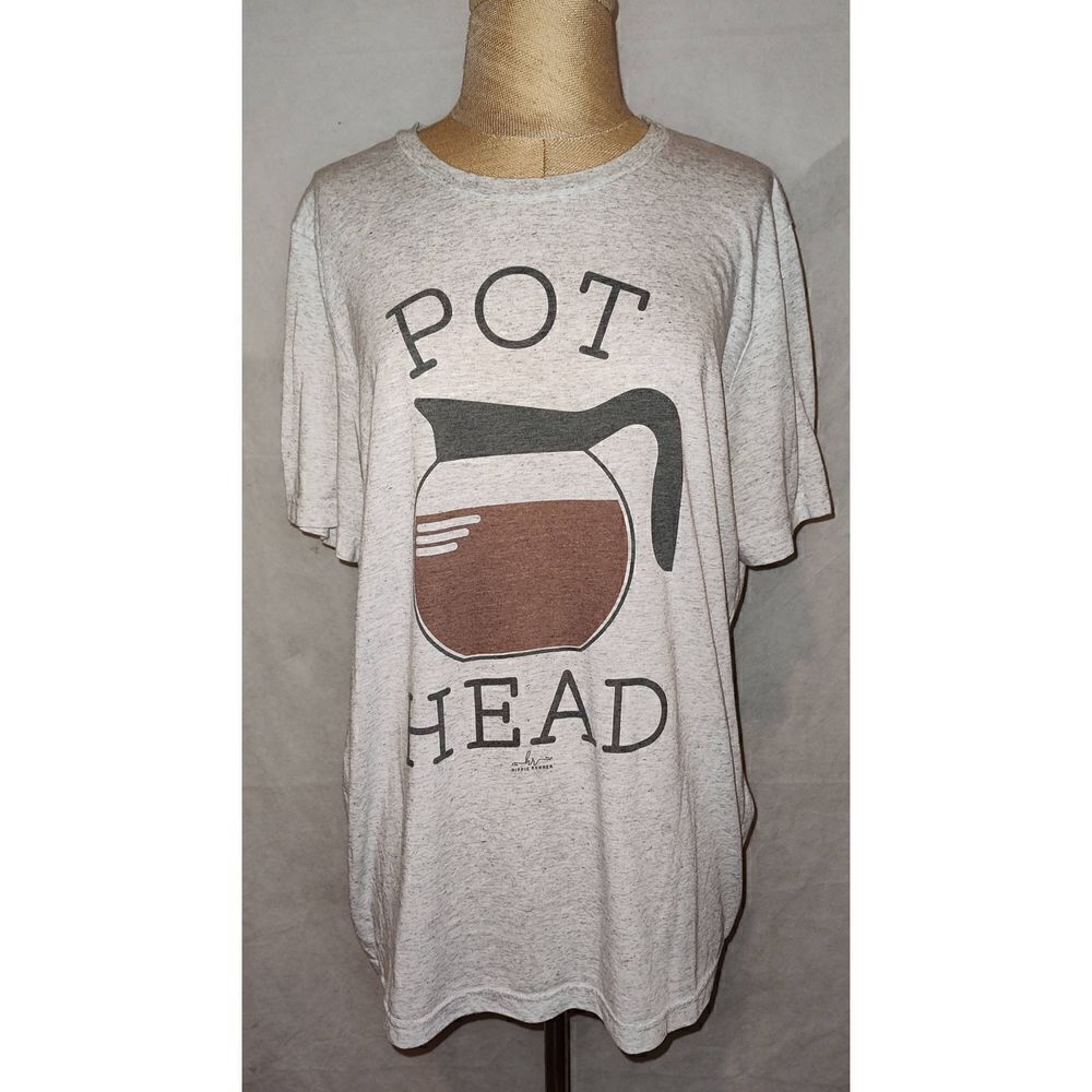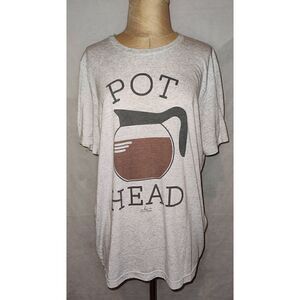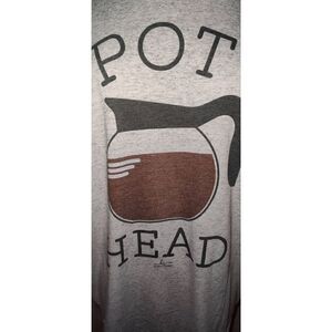 Grey t shirt "POT HEAD" with Coffee pot. Hippie Runner. No Size Tag. Measurements shoulder to hem 29". Armpit to armpit 22". Armpit to end of sleeve 3.75".