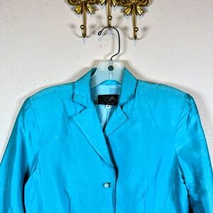 Yvonne LaFleur Vintage Bright turquoise blazer with a tailored silhouette and button-front closure. Lightweight construction for comfortable all-day wear. Classic notched collar and long sleeves create a polished, versatile look. Easy to pair with dresses, skirts, or trousers for work or events. 100% silk