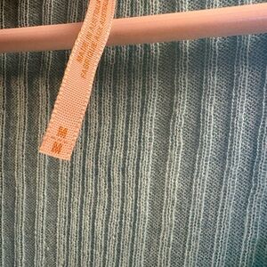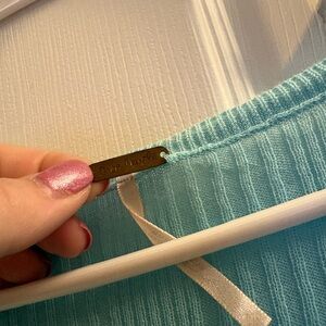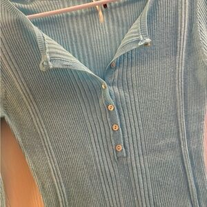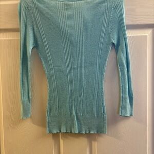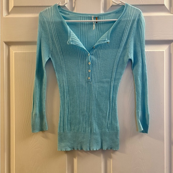 Fitted ribbed knit long sleeve top with a scoop neckline. Button-front placket with small pearly buttons. Slim silhouette with vertical rib detailing. Soft aqua color for a bright look. In excellent condition with no holes/stains. Size medium! Sleeves are 3/4 sleeves