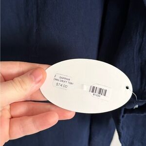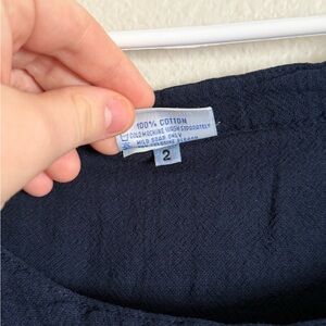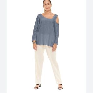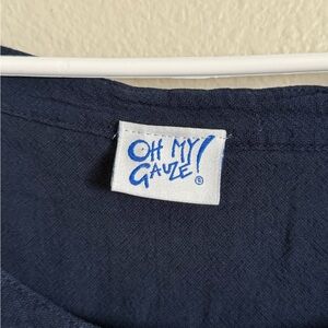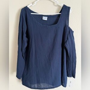 Dusty dark blue, cotton gauze blouse with open shoulder, and a slanted neck. The lightweight, breathable gauze material makes this the perfect staple piece for your spring and summer wardrobe. Relaxed fit, natural fibers, and clean lines are ideal for a bohemian, coastal chic, minimalist look! Great for vacation, resort wear, casual wear, and also office wear!