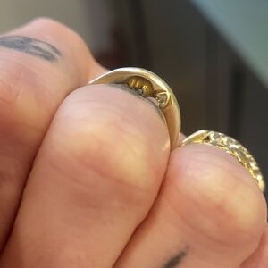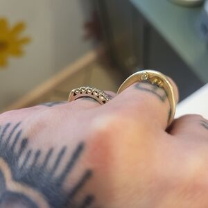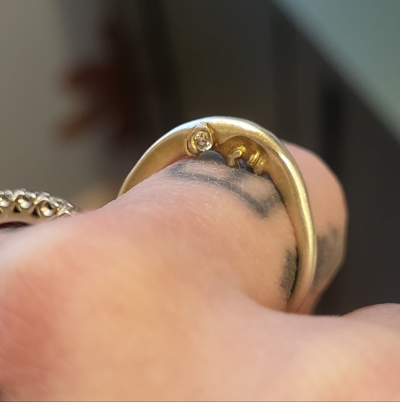 Sooo raaad! Amazing Sterling Silver man in the moon crescent moon ring with diamond eyes. Size 7. Was once 22k gold plated, but most of the plating has worn off with the exception of his face. Kinda looks like he has a 5 o'clock shadow now 🤣 Such and amazing piece, and very similar to the Catbird Anthony Michael Lent moonface pieces. Overall good condition. if you have any questions, please ask! thanks! *Catbird brand for exposure and for being a very similar style.