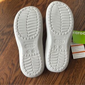 Lightweight Crocs flip flops. White straps with bright aqua footbeds. Cushioned textured insole for comfort. Easy slip-on style for everyday wear.
