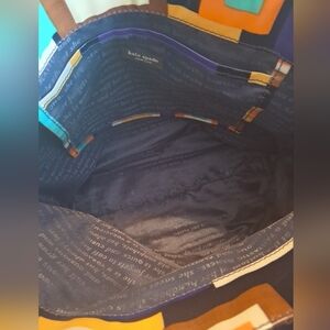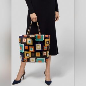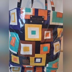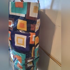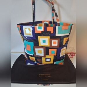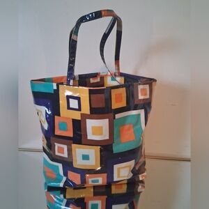 Add a pop of color to your outfit with this vibrant geometric tote bag. Perfect for everyday use, it combines style and functionality. Other then the small marks on the bag that's in 2 photos. The bag is in excellent Condition.