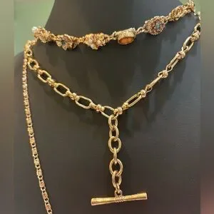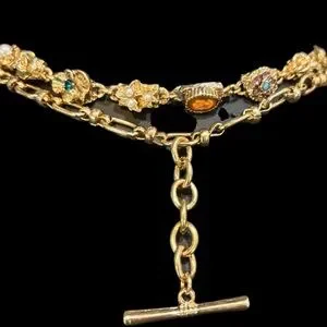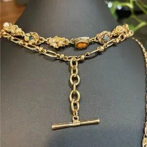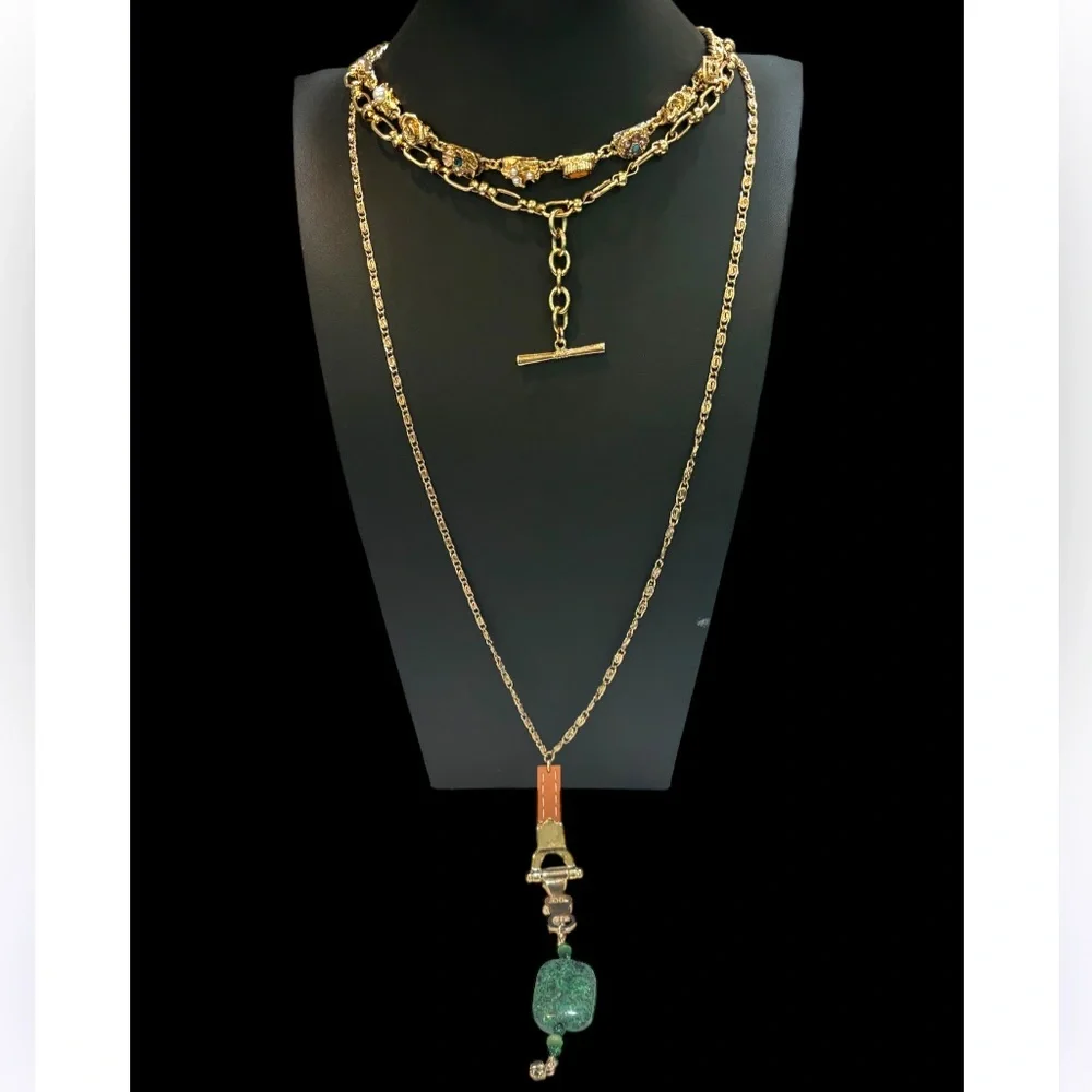 This head-turning Necklace is a layered design featuring colorful, vintage-inspired dangle details throughout for a unique, collected finish. The necklace incorporates different chain styles, a T-bar closure on the shorter layer, and a large pendant with leather and semi precious green stone.