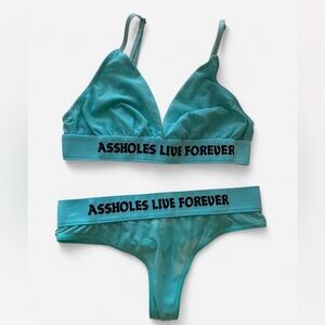 NWOT- great condition. Set both tagged a size small, bra measures- 12”-15” flat, thong measures 12.5”-14” flat. OG ALF merch from the first colorful mesh drop about 4 or 5 years ago. They do not sell these anymore!