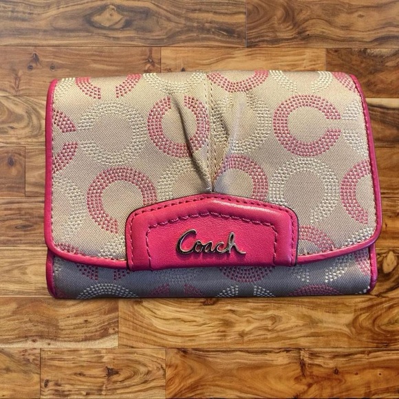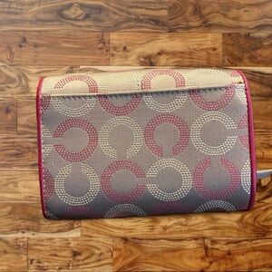 Coach clutch wallet with signature 'C' jacquard. Pink leather trim and logo plaque. Compact and stylish for daily use.