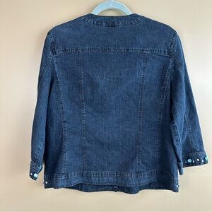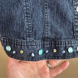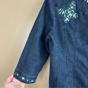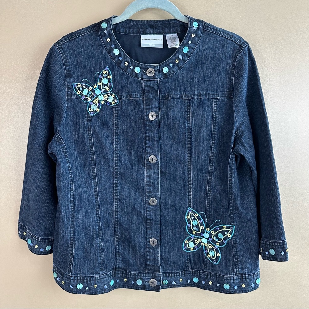 Denim Jean jacket artsy art to wear butterfly embroidered embroidery beaded embellished summer spring resort Grannycore grandma mature cottagecore