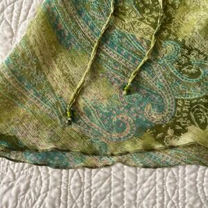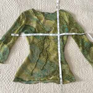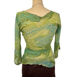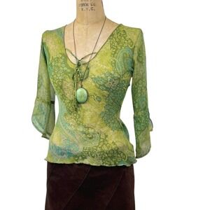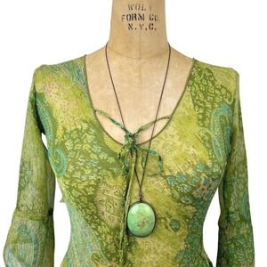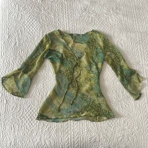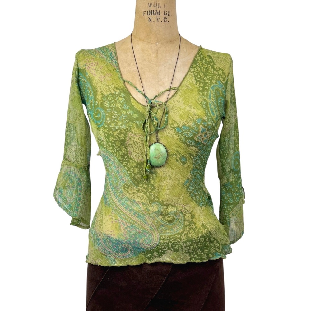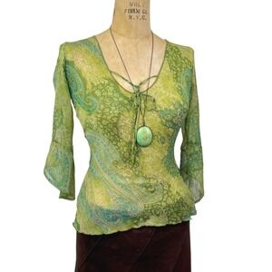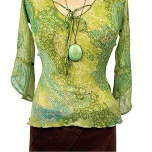 Sheer bell sleeve paisley top. This fairycore mesh blouse features a delicate tie-neck detail and vibrant green paisley print.