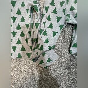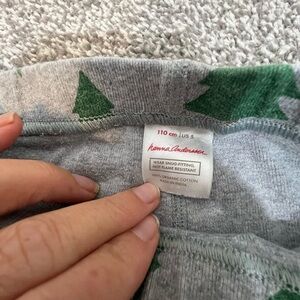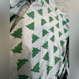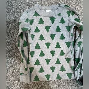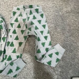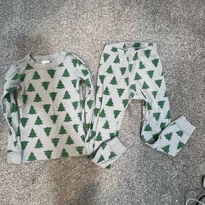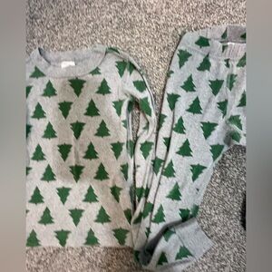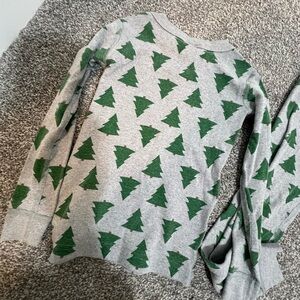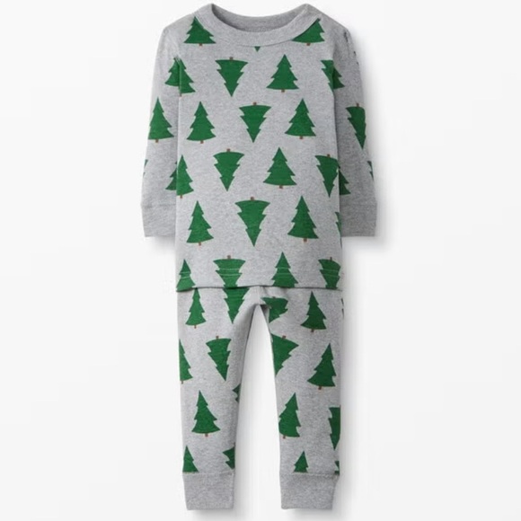 Soft gray pajamas with green tree design. Ideal for cozy nights. Holiday Long John Pajama Set | Hanna Andersson size 5