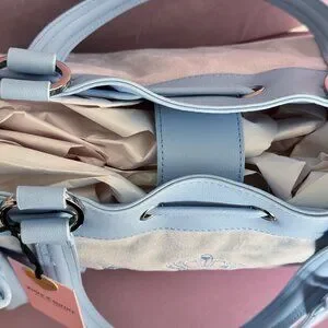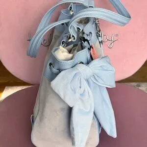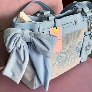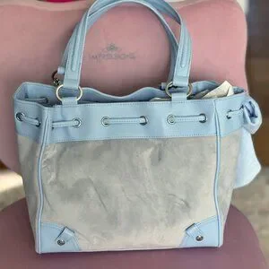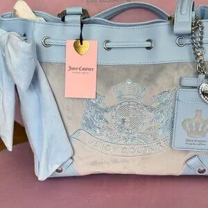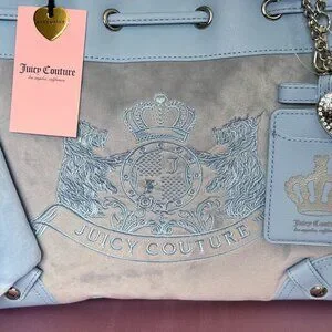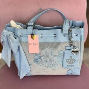 Juicy Couture Scottie Dogs Daydreamer Tote – New With Tags. Absolutely stunning and highly sought-after Juicy Couture tote featuring the iconic Scottie Dogs crest design in a soft pastel blue velour and faux leather trim.