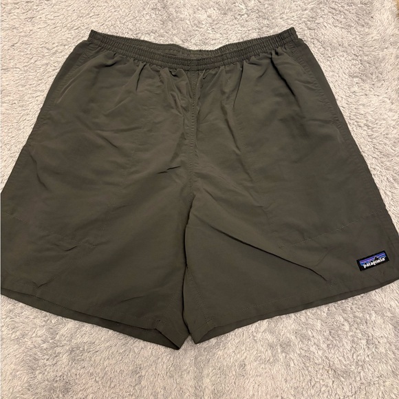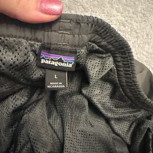 Patagonia athletic shorts. Elastic waistband for comfortable fit. Lightweight, quick-dry fabric for active use. Two side pockets for essentials. Subtle Patagonia logo on hem. In excellent used condition with no flaws. Men’s size large!